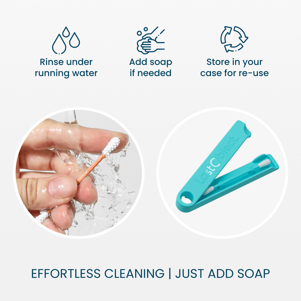 Dein LastSwab ersetzt etwa 1000 Einweg-Stäbchen. Damit es so lange wie möglich hält, solltest du es nach jedem Gebrauch vorsichtig reinigen. Verwende deine Fingerspitzen und reibe die Spitzen mit Wasser und Seife ab, um sie sauber zu bekommen. Bewahre es immer im Etui auf und halte es von Hitze fern. Reinige das Etui mit Desinfektionsmittel und niemals in der Spülmaschine.